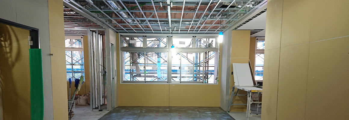 ボード工事は、主に鋼製下地(LGS)などに石膏ボードを貼る工事です。
